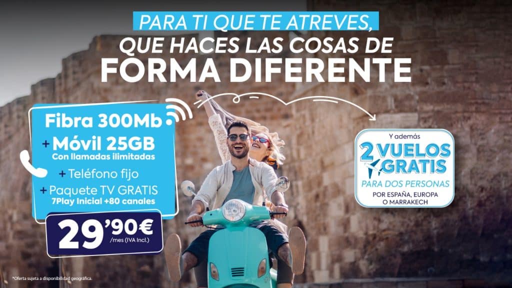 También tienes una tarifa ROMPEDORA: Fibra de 300Mb + teléfono fijo + móvil con 25GB y llamadas ilimitadas + TV, por solo 29,90€/mes. ¡Ah! Además, por tiempo limitado, tienes un regalo de dos vuelos para dos personas por España, Europa o Marrakech,